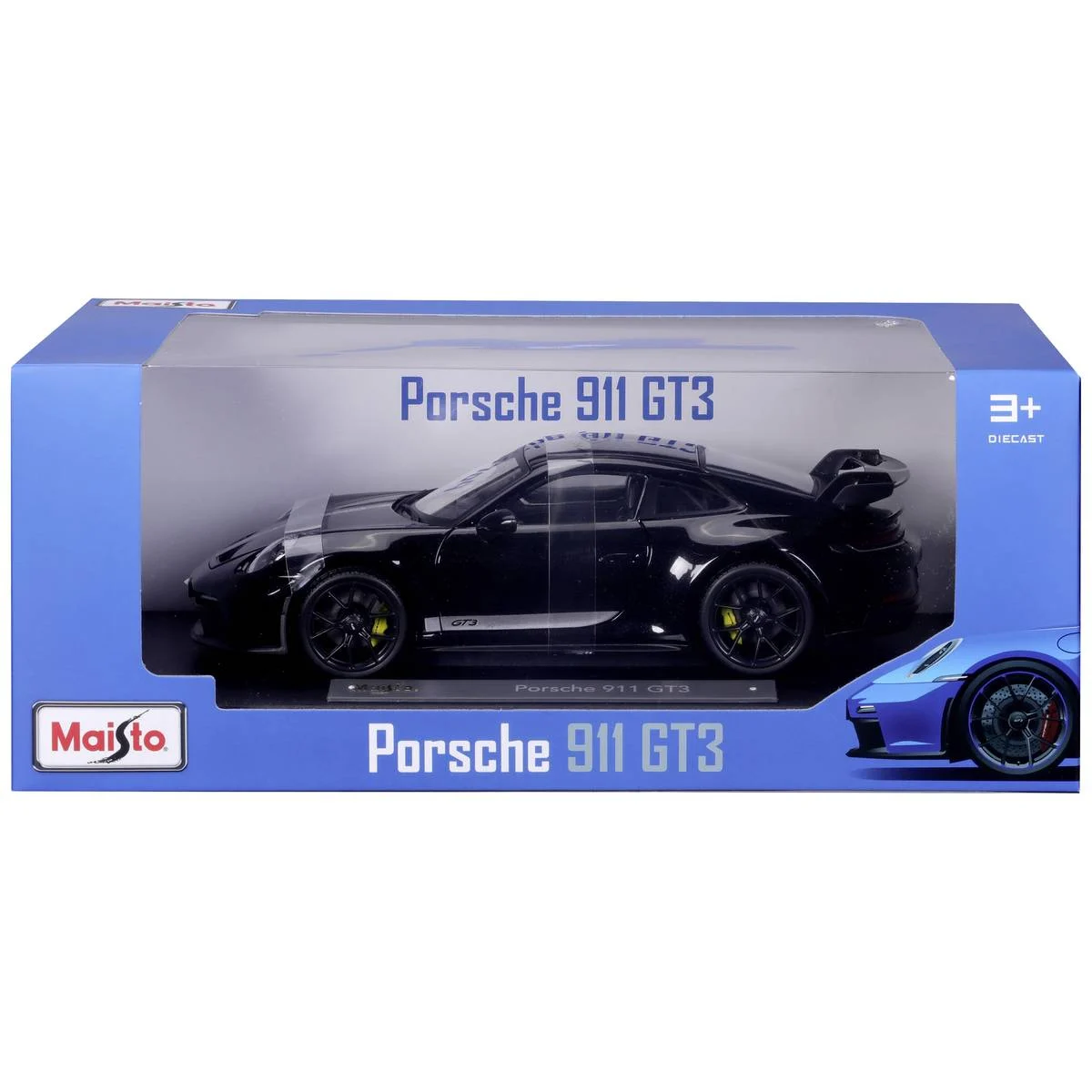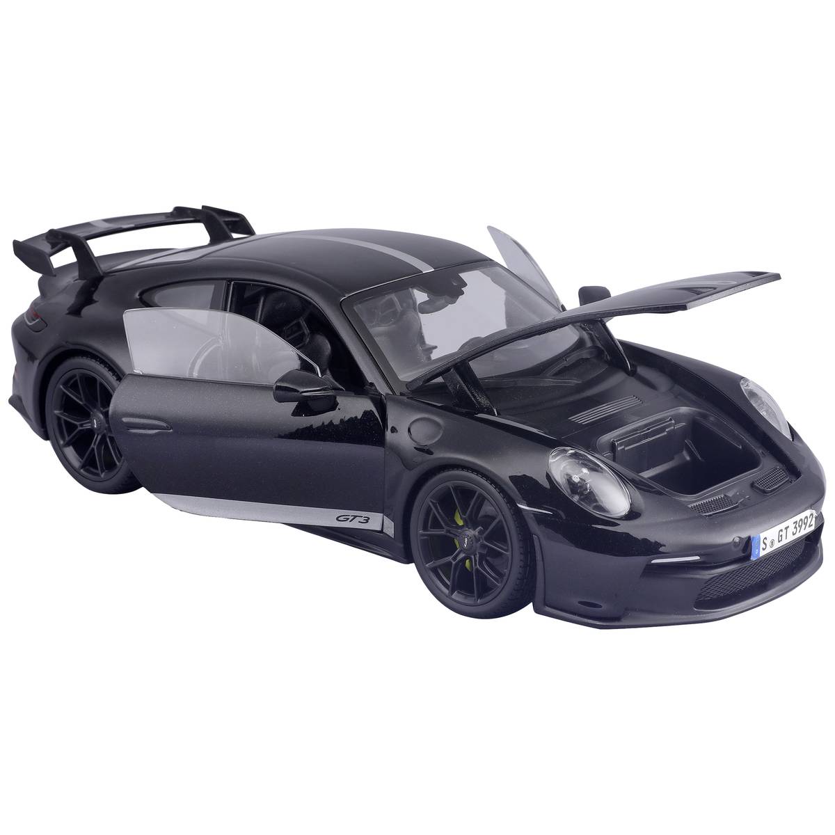 Avec sa carrosserie noire brillante, soulignée par des bandes racing distinctives, cette miniature capture toute l’intensité et le dynamisme de la véritable GT3. Son aileron arrière imposant, ses prises d’air sculptées et son intérieur détaillé en font un modèle de collection incontournable.